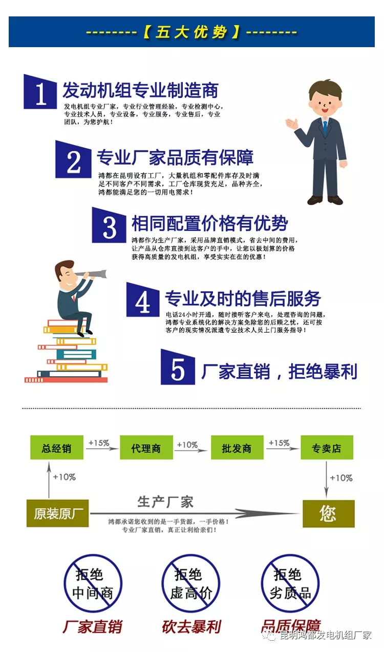 鸿都不能给您最低的价格,只能给您最高的品质;我们宁可为价格解释一阵子,也不愿为质量道歉一辈子!如果单纯为了追求销量, 完全可以通过降低生产测试成本达到快销的目的,但鸿都始终认为只有完美的品质,才是我们值得骄傲的!相同的配置,鸿都价格是最实惠的,因为我们是厂家直销。百度搜“鸿都发电机组”,云南专业厂家,可随时来看现货,配置为原装正品高配,相同配置,价格绝对最优惠。品牌厂家,现货直销 质量保证 100%正品保障。
